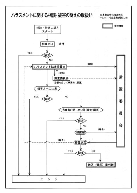 ハラスメント防止のためには加害者、被害者の周囲にいる第三者の態度が重要です。ハラスメント行為に対して見て見ぬふりをしたり、被害者のせいにしたり、組織や立場を守るためと称して、無かったことにしようとすることは加害者に加担する行為です。共同体の皆ですべての暴力に対してNOという立場をはっきりと表すことが二次被害や再発を防止する上で大事なことであります。ハラスメントは特異な人、あるいは特別な人が起こすのではなく、力の差があればどこでも起こり得、私たち自身も加害者にも被害者にもなることがあります。しかし「力」は目に見えて明らかなものだけでなく、時には「文化」や「教育」、また「指導」など、これまで多くの人が当然と受け止めていたような形をとっていることもあります。このことから、これまで当たり前だと思っていたことを意識化するための「気づき」のプログラムを実施することが重要であります。また、ハラスメントを防止するための仕組みや制度を整えていくということはハラスメント防止のためのひとつの側面に過ぎません。私たちがこの取り組みから学び、成長するように促されていることは、すべての人が神から与えられた交わりを回復するように働くことです。一人ひとりがこの世界の痛みや破れ、苦しみによる抑圧から解放され「一人の人間」として尊重される道筋の中にこの課題を位置づけたいと思います。